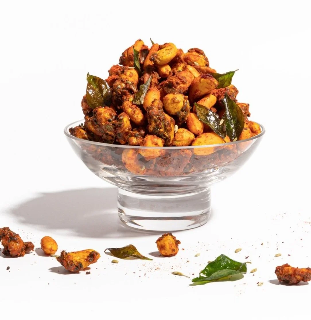 Sprinkle the cooled nuts with the Kashmiri chilli powder and the hot freshly fried curry leaves just before serving.